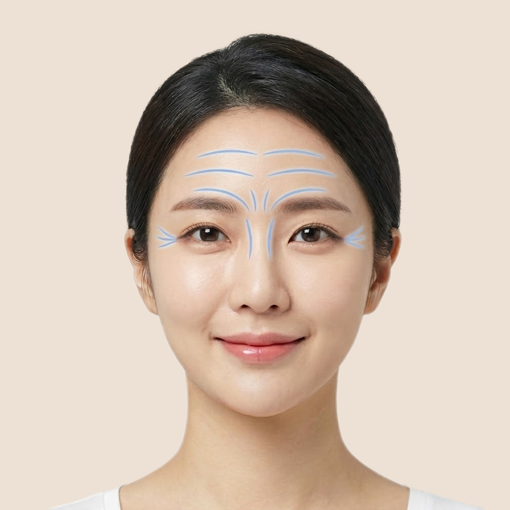 이마와 콧등 수평 주름, 미간의 수직 주름, 눈가 외측으로 뻗어나가는 주름에 완화시켜 줍니다. 주름이 예리하고 깊은 경우 필러 시술과 같이 하면 더 확실한 효과를 기대할 수 있습니다.