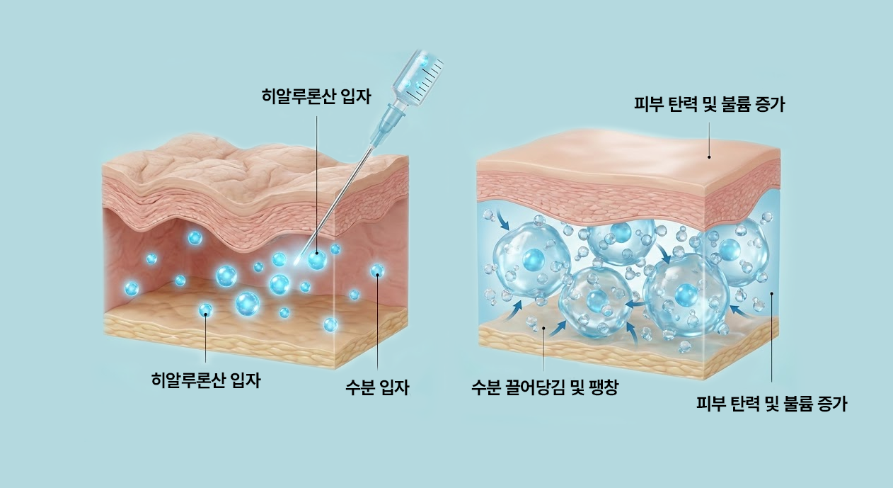 히알루론산 입자가 수분을 끌어당겨 피부를 팽팽하게 만드는 원리를 소개합니다.