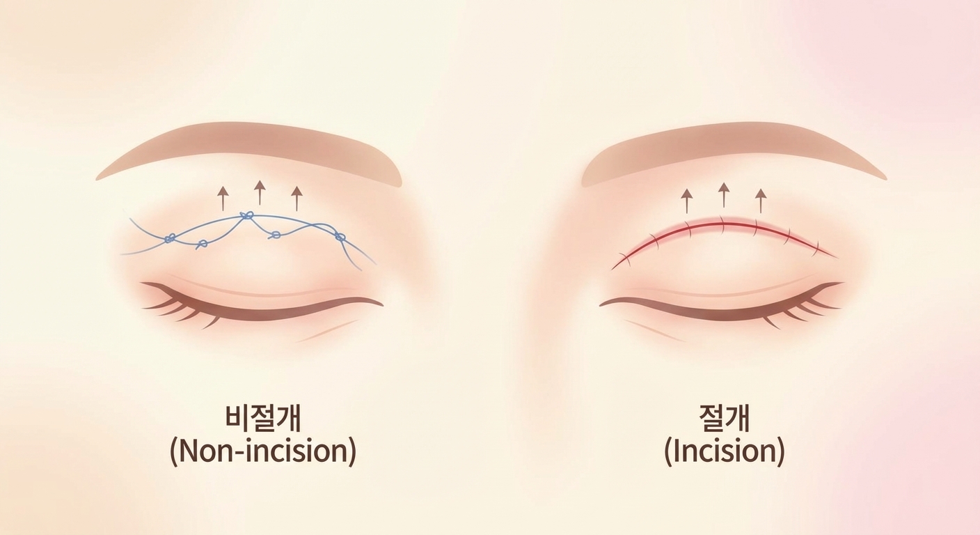 절개 없이 미세한 구멍을 통해 눈 뜨는 근육의 힘을 조절하는 수술법으로, 피부를 절개하지 않아 흉터가 거의 남지 않으며 붓기가 적어 일상 복귀가 매우 빠른 것이 특징입니다.